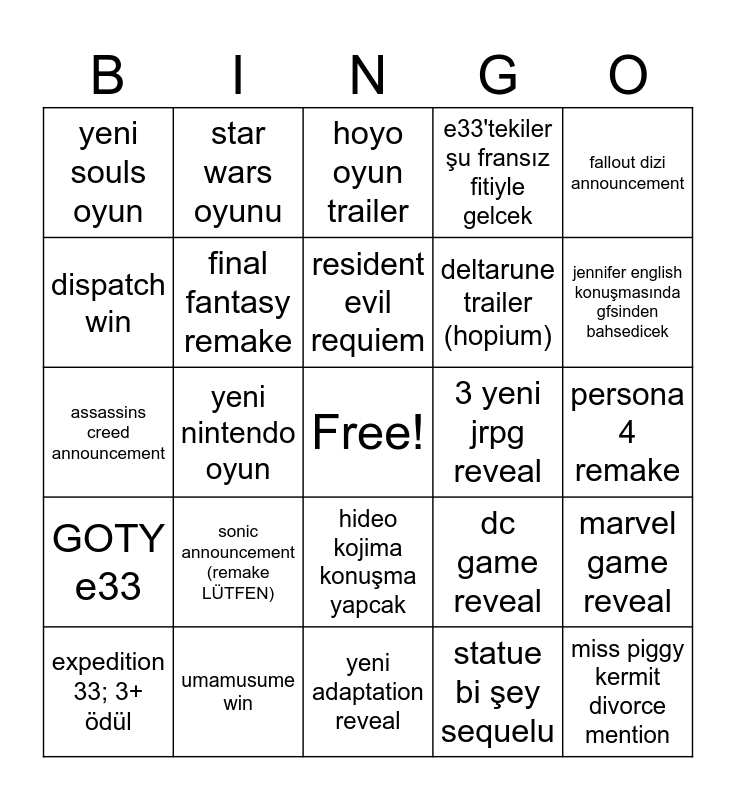 This bingo card has a free space and 24 words: expedition 33; 3+ ödül, sonic announcement (remake LÜTFEN), resident evil requiem, statue bi şey sequelu, fallout dizi announcement, yeni souls oyun, star wars oyunu, hoyo oyun trailer, 3 yeni jrpg reveal, persona 4 remake, assassins creed announcement, final fantasy remake, dc game reveal, marvel game reveal, dispatch win, umamusume win, yeni adaptation reveal, e33'tekiler şu fransız fitiyle gelcek, jennifer english konuşmasında gfsinden bahsedicek, GOTY e33, yeni nintendo oyun, hideo kojima konuşma yapcak, deltarune trailer (hopium) and miss piggy kermit divorce mention.
