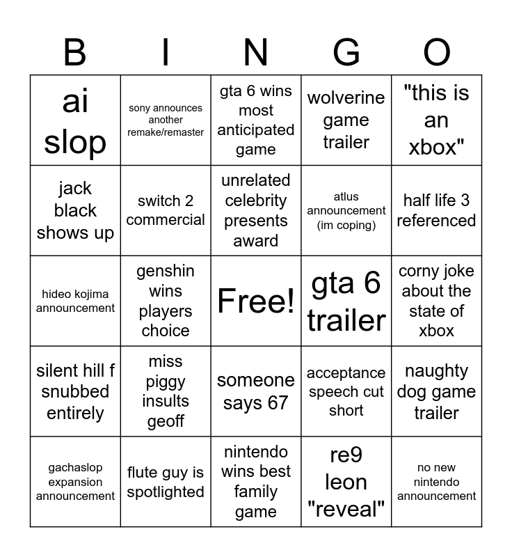 This bingo card has a free space and 24 words: miss piggy insults geoff, flute guy is spotlighted, unrelated celebrity presents award, gachaslop expansion announcement, "this is an xbox", ai slop, jack black shows up, sony announces another remake/remaster, gta 6 trailer, someone says 67, atlus announcement (im coping), hideo kojima announcement, acceptance speech cut short, naughty dog game trailer, switch 2 commercial, re9 leon "reveal", corny joke about the state of xbox, gta 6 wins most anticipated game, half life 3 referenced, genshin wins players choice, no new nintendo announcement, silent hill f snubbed entirely, wolverine game trailer and nintendo wins best family game.