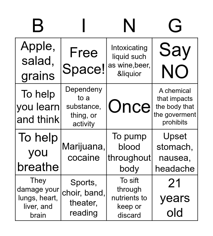 This bingo card has 16 words: Sports, choir, band, theater, reading, Upset stomach, nausea, headache, Intoxicating liquid such as wine,beer, &liquior, Apple, salad, grains, To help you breathe, Free Space!, To pump blood throughout body, To sift through nutrients to keep or discard, To help you learn and think, Dependeny to a substance, thing, or activity, They damage your lungs, heart, liver, and brain, Say NO, Marijuana, cocaine, A chemical that impacts the body that the goverment prohibits, Once and 21 years old.