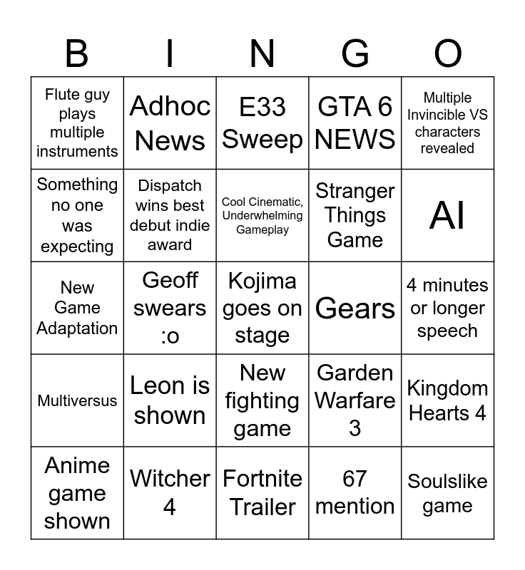 This bingo card has a free space and 44 words: Half Life 3 (+1 bingo), Soulslike game, 007 game, Anime game shown, KOTOR, 67 mention, E33 Sweep, Muppet appears, Multiple Invincible VS characters revealed, Witcher 4, GTA 6 NEWS, Gears, New fighting game, Leon is shown, Something goes wrong, Fortnite Trailer, State of Decay 3 news, New Game Adaptation, Random game collab, AI, Adhoc News, Random celebrity appearance, Death Stranding 2 wins GOTY, Flute guy plays multiple instruments, God of War new game, 4 minutes or longer speech, Marvel Rivals, Warframe, Garden Warfare 3, Multiversus, Persona, Kingdom Hearts 4, Geoff AURA, Geoff mispeaks, Geoff swears :o, Star Wars Racing, Random Youtuber Appearance, Intergalactic the heretic prophet, Cool Cinematic, Underwhelming Gameplay, Something no one was expecting, Stranger Things Game, Survival Game, Dispatch wins best debut indie award and Minecraft Movie wins best adaptation.