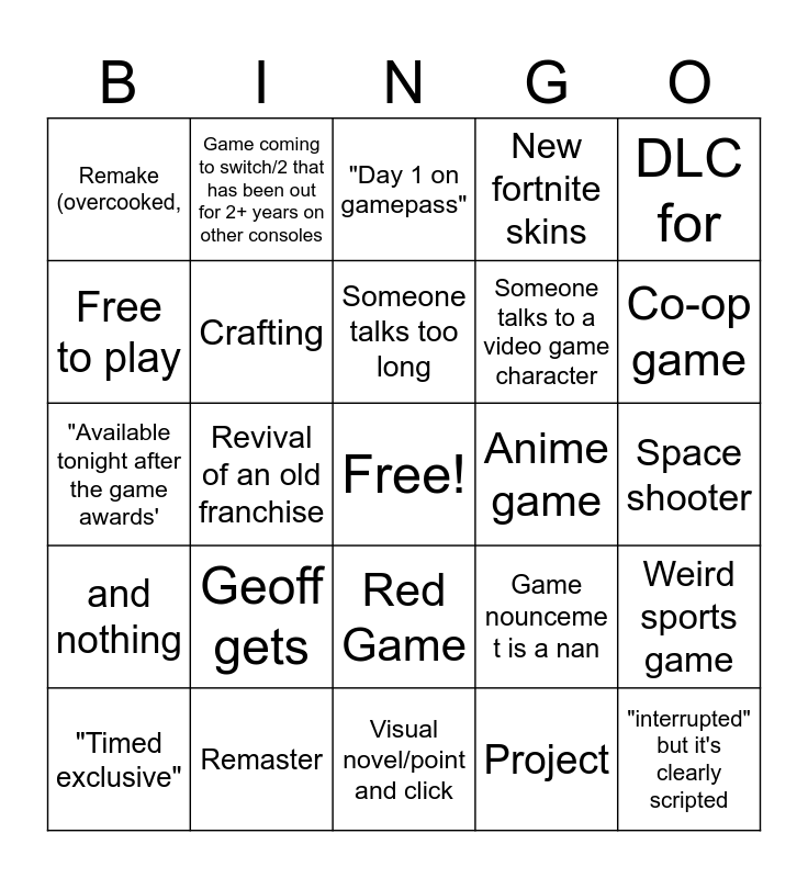 This bingo card has a free space and 36 words: Roguelike Soulslike, Hero shooter, Farming, Crafting, Game nounceme t is a nan, and nothing, Someone talks too long, Random celebrity shows up, DLC for, currently popular game, Revival of an old franchise, New fortnite skins, Mech game, Anime game, Co-op game, Remake (overcooked,, it takes two), Geoff gets, "interrupted" but it's clearly scripted, "Day 1 on gamepass", Space shooter, Weird sports game, Remaster, "Timed exclusive", Visual novel/point and click, Game coming to switch/2 that has been out for 2+ years on other consoles, "Available tonight after the game awards', Game that looks like a ripoff of something already popular, Someone talks to a video game character, Free to play, Final announcement is underwhelming, New CD, Project, Red Game, No and GTA6.