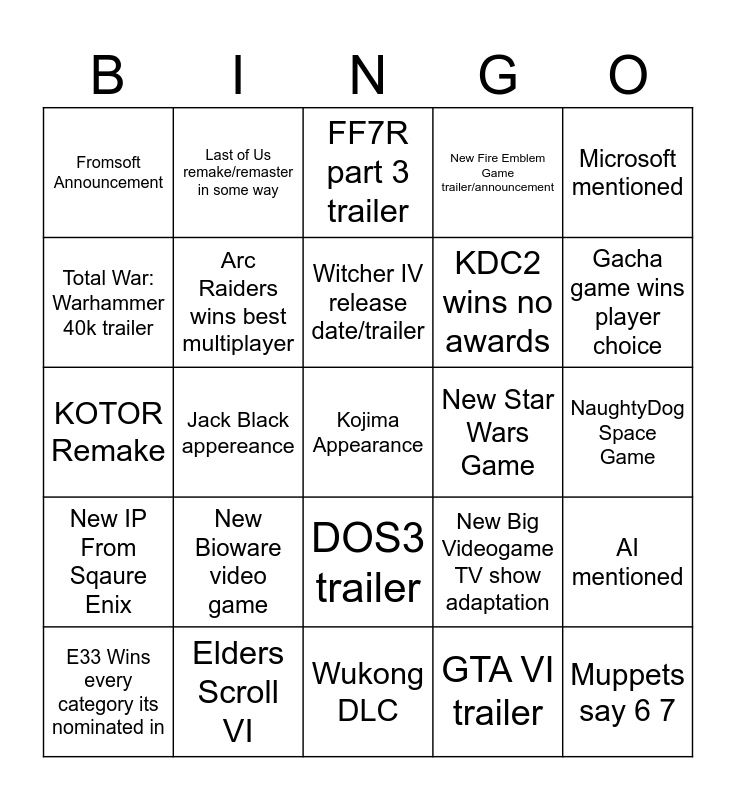 This bingo card has a free space and 24 words: New Bioware video game, Elders Scroll VI, Witcher IV release date/trailer, E33 Wins every category its nominated in, Microsoft mentioned, Fromsoft Announcement, Total War: Warhammer 40k trailer, Last of Us remake/remaster in some way, New Star Wars Game, DOS3 trailer, KDC2 wins no awards, KOTOR Remake, New Big Videogame TV show adaptation, AI mentioned, Arc Raiders wins best multiplayer, GTA VI trailer, NaughtyDog Space Game, FF7R part 3 trailer, Gacha game wins player choice, Jack Black appereance, Muppets say 6 7, New IP From Sqaure Enix, New Fire Emblem Game trailer/announcement and Wukong DLC.