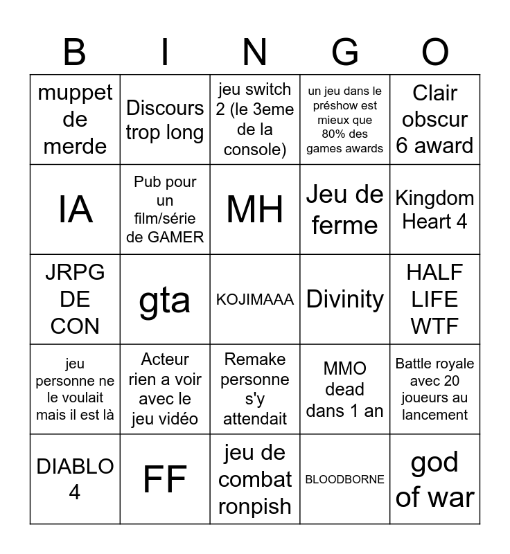 This bingo card has a free space and 24 words: Acteur rien a voir avec le jeu vidéo, FF, MH, DIABLO 4, Clair obscur 6 award, muppet de merde, IA, Discours trop long, Divinity, Remake personne s'y attendait, Jeu de ferme, JRPG DE CON, MMO dead dans 1 an, Battle royale avec 20 joueurs au lancement, Pub pour un film/série de GAMER, BLOODBORNE, HALF LIFE WTF, jeu switch 2 (le 3eme de la console), Kingdom Heart 4, gta, god of war, jeu personne ne le voulait mais il est là, un jeu dans le préshow est mieux que 80% des games awards and jeu de combat ronpish.