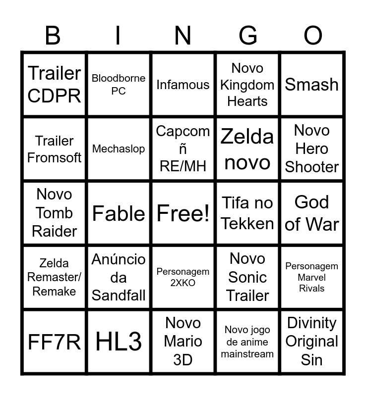 This bingo card has a free space and 24 words: Anúncio da Sandfall, HL3, Capcom ñ RE/MH, FF7R, Smash, Trailer CDPR, Trailer Fromsoft, Bloodborne PC, Tifa no Tekken, Personagem 2XKO, Zelda novo, Novo Tomb Raider, Novo Sonic Trailer, Personagem Marvel Rivals, Mechaslop, Novo jogo de anime mainstream, God of War, Infamous, Novo Hero Shooter, Fable, Divinity Original Sin, Zelda Remaster/ Remake, Novo Kingdom Hearts and Novo Mario 3D.