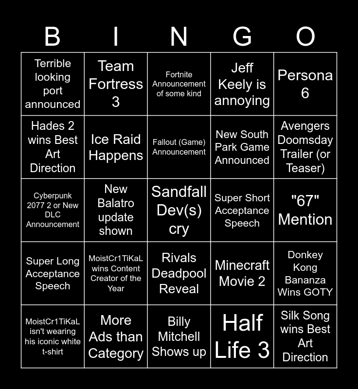 This bingo card has 70 words: Hideo Kojima looks lifeless, "67" Mention, Clair Obscure Sweep, Clair Obscure Wins GOTY, More Ads than Category, AI Game Advertised, Jeff Keely is annoying, Microsoft shills something, Persona 6, Rivals Cyclops Reveal, Donkey Kong Bananza Wins GOTY, God of War reveal, Terrible looking port announced, Fortnite Announcement of some kind, New Friends of Balatro Announced, New Balatro update shown, Rivals Deadpool Reveal, New South Park Game Announced, New Minecraft Update Announced, Super Long Acceptance Speech, Super Short Acceptance Speech, Minecraft Movie 2, Avengers Doomsday Trailer (or Teaser), Dispatch Season 2 Announced (or Teased), New FNaF Game Announced (or Teased), GTA 6 Trailer, Until Dawn wins "Best Adaptation", New Console Reveal, Half Life 3, Portal 3, Team Fortress 3, Cryptic Teaser, New Insomniac Spider-Man game Announced, Jeff Keely is executed live on stage, Risk of Rain 3, Pokemon Announcement of some kind, Overwatch 2 Announcement of some kind, Hades 2 wins Best Music, Silk Song wins Best Music, Hades 2 wins Best Art Direction, Silk Song wins Best Art Direction, MoistCr1TiKaL wins Content Creator of the Year, Sandfall Dev(s) cry, The French Appear., New Invincible VS character announced, Ice Raid Happens, MoistCr1TiKaL isn't wearing his iconic white t-shirt, Silk Song 2, Deltarune, Israel Mention, Palestine Mention, Lego Batman Game Footage, Peak Mention, Trump Shows up, Billy Mitchell Shows up, Bombs Drop, Fallout (Game) Announcement, Fallout (Show) Announcement, FNaF Movie 3 Announcement, New VR Headset Announced, Cyberpunk 2077 2 or New DLC Announcement, New Super Smash Bros Announcement, New Elder Scrolls, Anti AI Speech, Nothingburger Speech, Charlie Kirk Song, New Fromsoftware Game Reveal, Roblox E-Dating Update announced, New Splatoon Announced and New Pikmin Announced.