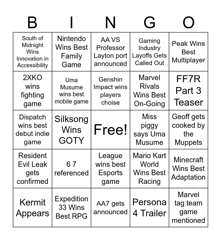 This bingo card has a free space and 24 words: 6 7 referenced, Expedition 33 Wins Best RPG, Genshin Impact wins players choise, Kermit Appears, Peak Wins Best Multiplayer, South of Midnight Wins Innovation in Accessibility, 2XKO wins fighting game, Nintendo Wins Best Family Game, Miss piggy says Uma Musume, League wins best Esports game, Marvel Rivals Wins Best On-Going, Dispatch wins best debut indie game, Mario Kart World Wins Best Racing, Minecraft Wins Best Adaptation, Uma Musume wins best mobile game, Persona 4 Trailer, Geoff gets cooked by the Muppets, AA VS Professor Layton port announced, FF7R Part 3 Teaser, Silksong Wins GOTY, Marvel tag team game mentioned, Resident Evil Leak gets confirmed, Gaming Industry Layoffs Gets Called Out and AA7 gets announced.