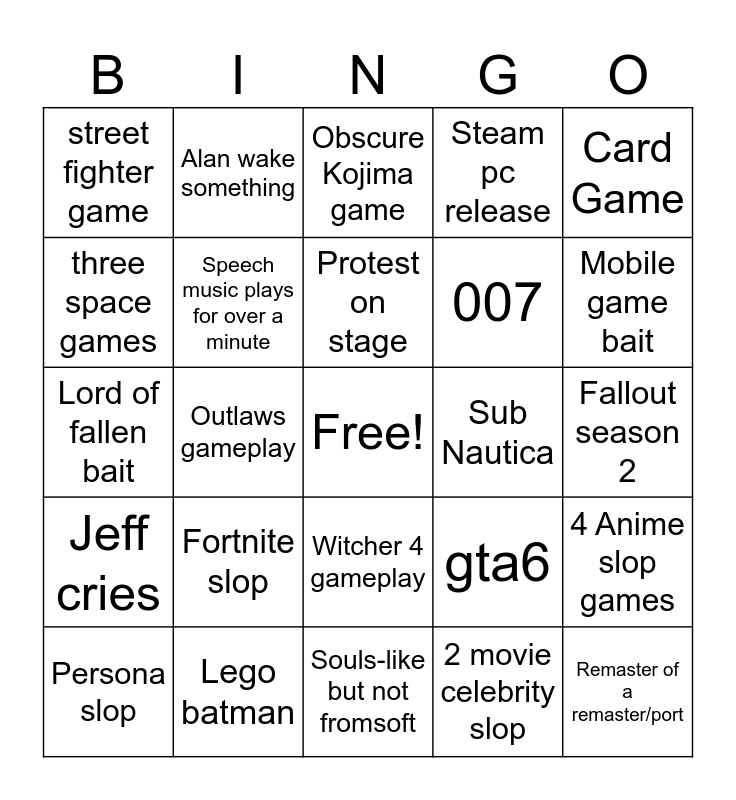 This bingo card has a free space and 24 words: Fortnite slop, Lego batman, Protest on stage, Persona slop, Card Game, street fighter game, three space games, Alan wake something, Sub Nautica, Witcher 4 gameplay, 007, Lord of fallen bait, gta6, 4 Anime slop games, Speech music plays for over a minute, 2 movie celebrity slop, Fallout season 2, Obscure Kojima game, Mobile game bait, Outlaws gameplay, Remaster of a remaster/port, Jeff cries, Steam pc release and Souls-like but not fromsoft.