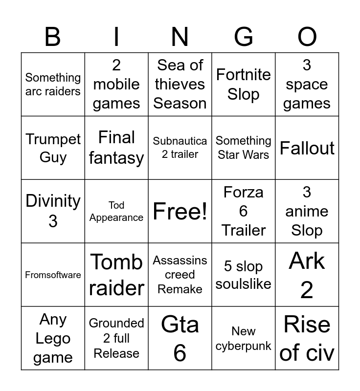 This bingo card has a free space and 24 words: Tomb raider, Grounded 2 full Release, Subnautica 2 trailer, Any Lego game, 3 space games, Something arc raiders, Trumpet Guy, 2 mobile games, Forza 6 Trailer, Assassins creed Remake, Something Star Wars, Divinity 3, 5 slop soulslike, Ark 2, Final fantasy, New cyberpunk, 3 anime Slop, Sea of thieves Season, Fallout, Tod Appearance, Rise of civ, Fromsoftware, Fortnite Slop and Gta 6.
