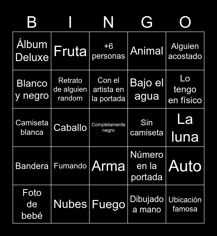 This bingo card has a free space and 24 words: Fumando, Nubes, Con el artista en la portada, Foto de bebé, Alguien acostado, Álbum Deluxe, Blanco y negro, Fruta, Sin camiseta, Arma, Bajo el agua, Camiseta blanca, Número en la portada, Auto, Retrato de alguien random, Dibujado a mano, La luna, +6 personas, Lo tengo en físico, Caballo, Ubicación famosa, Bandera, Animal and Fuego.