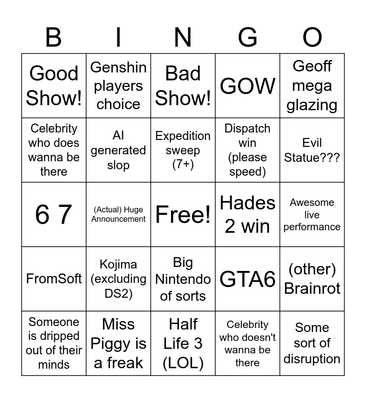 This bingo card has a free space and 24 words: Kojima (excluding DS2), Miss Piggy is a freak, Expedition sweep (7+), Someone is dripped out of their minds, Geoff mega glazing, Good Show!, Celebrity who does wanna be there, Genshin players choice, Hades 2 win, Big Nintendo of sorts, Dispatch win (please speed), 6 7, GTA6, (other) Brainrot, AI generated slop, Celebrity who doesn't wanna be there, Awesome live performance, Bad Show!, Evil Statue???, (Actual) Huge Announcement, Some sort of disruption, FromSoft, GOW and Half Life 3 (LOL).