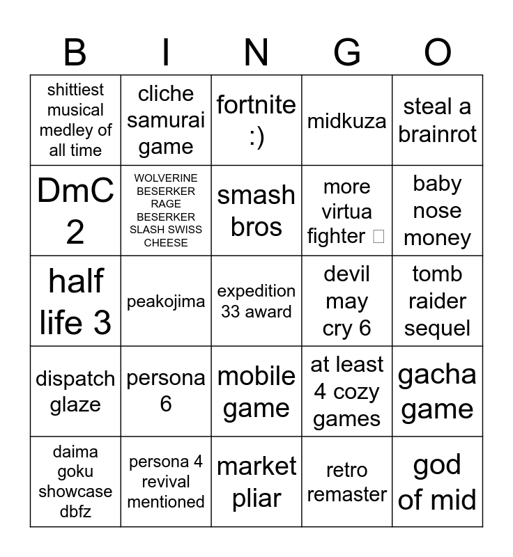 This bingo card has a free space and 24 words: persona 6, persona 4 revival mentioned, smash bros, daima goku showcase dbfz, steal a brainrot, shittiest musical medley of all time, DmC 2, cliche samurai game, devil may cry 6, mobile game, more virtua fighter , half life 3, at least 4 cozy games, gacha game, WOLVERINE BESERKER RAGE BESERKER SLASH SWISS CHEESE, retro remaster, tomb raider sequel, fortnite :), baby nose money, peakojima, god of mid, dispatch glaze, midkuza and market pliar.