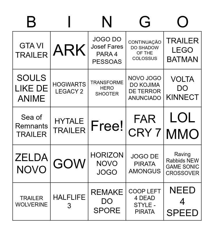This bingo card has a free space and 24 words: GOW, HALFLIFE 3, TRANSFORME HERO SHOOTER, TRAILER WOLVERINE, TRAILER LEGO BATMAN, GTA VI TRAILER, SOULS LIKE DE ANIME, ARK, FAR CRY 7, HORIZON NOVO JOGO, NOVO JOGO DO KOJIMA DE TERROR ANUNCIADO, Sea of Remnants TRAILER, JOGO DE PIRATA AMONGUS, Raving Rabbids NEW GAME SONIC CROSSOVER, HOGWARTS LEGACY 2, COOP LEFT 4 DEAD STYLE - PIRATA, LOL MMO, JOGO DO Josef Fares PARA 4 PESSOAS, VOLTA DO KINNECT, HYTALE TRAILER, NEED 4 SPEED, ZELDA NOVO, CONTINUAÇÃO DO SHADOW OF THE COLOSSUS and REMAKE DO SPORE.