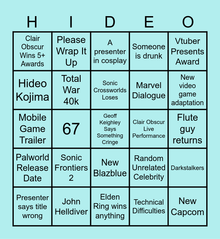 This bingo card has a free space and 24 words: Sonic Frontiers 2, John Helldiver, Sonic Crossworlds Loses, Presenter says title wrong, Vtuber Presents Award, Clair Obscur Wins 5+ Awards, Hideo Kojima, Please Wrap It Up, Clair Obscur Live Performance, New Blazblue, Marvel Dialogue, Mobile Game Trailer, Random Unrelated Celebrity, Darkstalkers, Total War 40k, Technical Difficulties, Flute guy returns, A presenter in cosplay, New video game adaptation, 67, New Capcom, Palworld Release Date, Someone is drunk and Elden Ring wins anything.