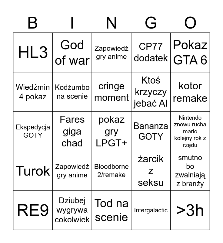 This bingo card has a free space and 24 words: Zapowiedź gry anime, Dziubej wygrywa cokolwiek, cringe moment, RE9, Pokaz GTA 6, HL3, Wiedźmin 4 pokaz, God of war, Bananza GOTY, Bloodborne 2/remake, Ktoś krzyczy jebać AI, Ekspedycja GOTY, żarcik z seksu, smutno bo zwalniają z branży, Kodżumbo na scenie, Intergalactic, Nintendo znowu rucha mario kolejny rok z rzędu, Zapowiedź gry anime, kotor remake, Fares giga chad, >3h, Turok, CP77 dodatek and Tod na scenie.