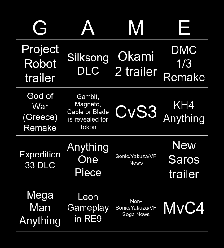 This bingo card has 16 words: Leon Gameplay in RE9, New Saros trailer, Okami 2 trailer, Project Robot trailer, Expedition 33 DLC, Silksong DLC, Sonic/Yakuza/VF News, Non-Sonic/Yakuza/VF Sega News, God of War (Greece) Remake, Gambit, Magneto, Cable or Blade is revealed for Tokon, Mega Man Anything, DMC 1/3 Remake, Anything One Piece, KH4 Anything, CvS3 and MvC4.