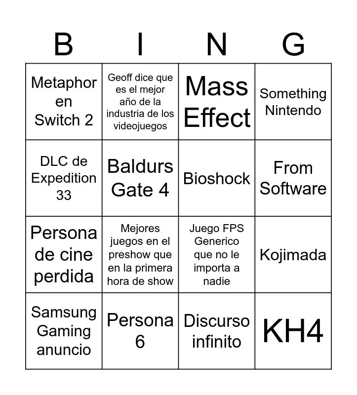 This bingo card has 16 words: Persona 6, Kojimada, Mass Effect, Metaphor en Switch 2, Persona de cine perdida, Geoff dice que es el mejor año de la industria de los videojuegos, Juego FPS Generico que no le importa a nadie, Discurso infinito, DLC de Expedition 33, Baldurs Gate 4, Samsung Gaming anuncio, Something Nintendo, Mejores juegos en el preshow que en la primera hora de show, From Software, Bioshock and KH4.