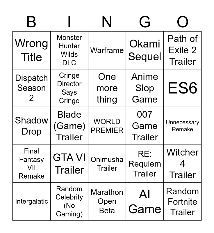 This bingo card has a free space and 24 words: GTA VI Trailer, Random Celebrity (No Gaming), One more thing, Intergalatic, Path of Exile 2 Trailer, Wrong Title, Dispatch Season 2, Monster Hunter Wilds DLC, 007 Game Trailer, Onimusha Trailer, Anime Slop Game, Shadow Drop, RE: Requiem Trailer, Witcher 4 Trailer, Cringe Director Says Cringe, AI Game, Unnecessary Remake, Warframe, ES6, Blade (Game) Trailer, Random Fortnite Trailer, Final Fantasy VII Remake, Okami Sequel and Marathon Open Beta.