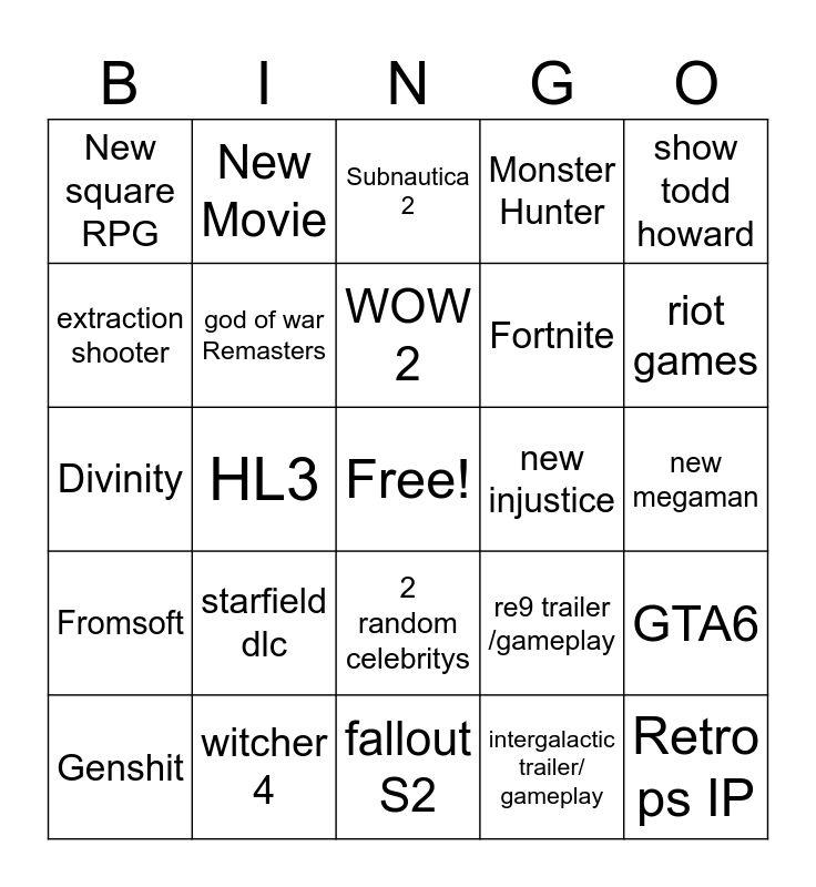 This bingo card has a free space and 24 words: Genshit, starfield dlc, WOW 2, intergalactic trailer/ gameplay, show todd howard, New square RPG, New Movie, Subnautica 2, new injustice, new megaman, Divinity, god of war Remasters, re9 trailer /gameplay, GTA6, extraction shooter, witcher 4, fallout S2, Monster Hunter, riot games, Fromsoft, HL3, 2 random celebritys, Fortnite and Retro ps IP.