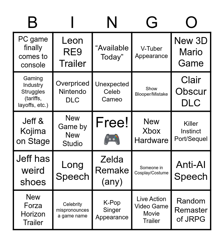 This bingo card has a free space and 24 words: Long Speech, Celebrity mispronounces a game name, Unexpected Celeb Cameo, New Forza Horizon Trailer, New 3D Mario Game, PC game finally comes to console, Gaming Industry Struggles (tariffs, layoffs, etc.), Leon RE9 Trailer, New Xbox Hardware, Zelda Remake (any), Show Blooper/Mistake, Jeff & Kojima on Stage, Someone in Cosplay/Costume, Anti-AI Speech, Overpriced Nintendo DLC, Live Action Video Game Movie Trailer, Killer Instinct Port/Sequel, “Available Today”, Clair Obscur DLC, New Game by New Studio, Random Remaster of JRPG, Jeff has weird shoes, V-Tuber Appearance and K-Pop Singer Appearance.