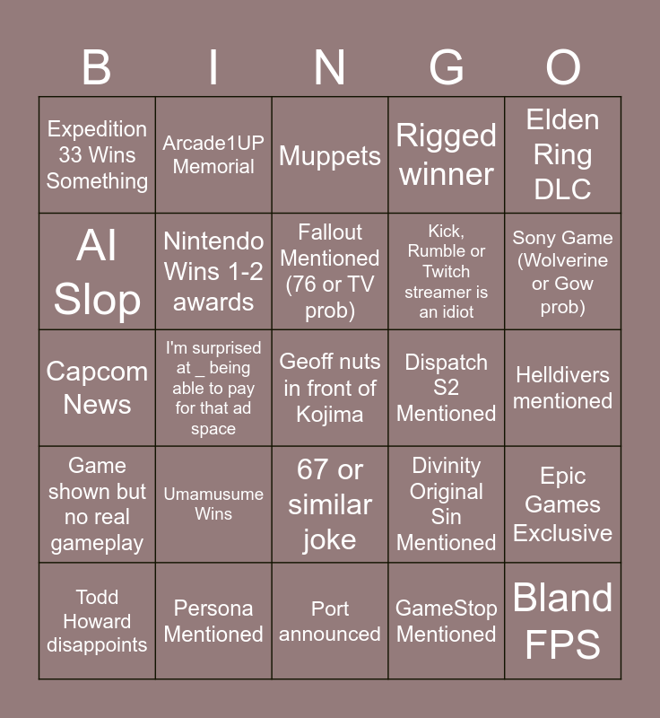 This bingo card has a free space and 24 words: Umamusume Wins, Persona Mentioned, Fallout Mentioned (76 or TV prob), Todd Howard disappoints, Elden Ring DLC, Expedition 33 Wins Something, AI Slop, Arcade1UP Memorial, Dispatch S2 Mentioned, 67 or similar joke, Kick, Rumble or Twitch streamer is an idiot, Capcom News, Divinity Original Sin Mentioned, Epic Games Exclusive, Nintendo Wins 1-2 awards, GameStop Mentioned, Helldivers mentioned, Muppets, Sony Game (Wolverine or Gow prob), I'm surprised at _ being able to pay for that ad space, Bland FPS, Game shown but no real gameplay, Rigged winner and Port announced.