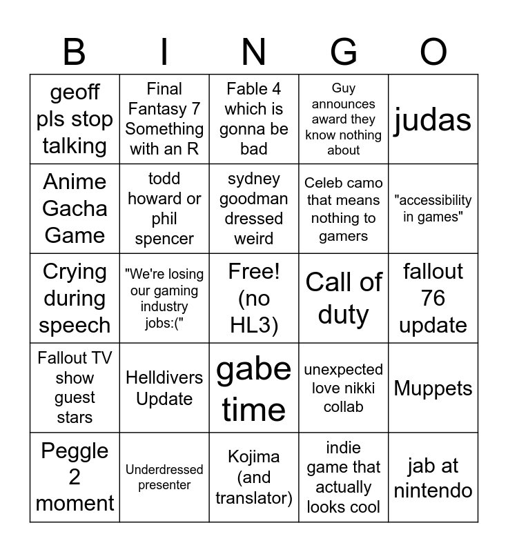 This bingo card has a free space and 28 words: Muppets, Leon Kennedy confirmed for re9, Celeb camo that means nothing to gamers, indie game that actually looks cool, Anime Gacha Game, Fable 4 which is gonna be bad, Final Fantasy 7 Something with an R, Fallout TV show guest stars, Call of duty, Peggle 2 moment, Crying during speech, Guy announces award they know nothing about, Underdressed presenter, Kojima (and translator), "accessibility in games", Uncomfy musical number, Helldivers Update, todd howard or phil spencer, sydney goodman dressed weird, gabe time, geoff pls stop talking, something wins goty that causes tension, jab at nintendo, "We're losing our gaming industry jobs:(", fallout 76 update, unexpected love nikki collab, judas and telltale style game.