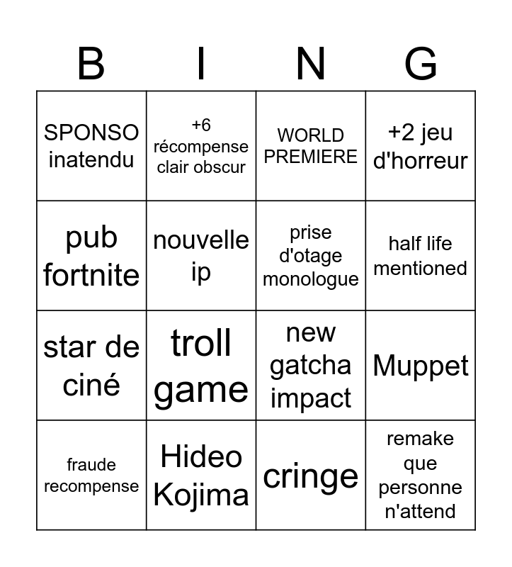 This bingo card has 16 words: Hideo Kojima, Muppet, WORLD PREMIERE, SPONSO inatendu, star de ciné, +6 récompense clair obscur, new gatcha impact, cringe, pub fortnite, nouvelle ip, fraude recompense, +2 jeu d'horreur, troll game, half life mentioned, prise d'otage monologue and remake que personne n'attend.
