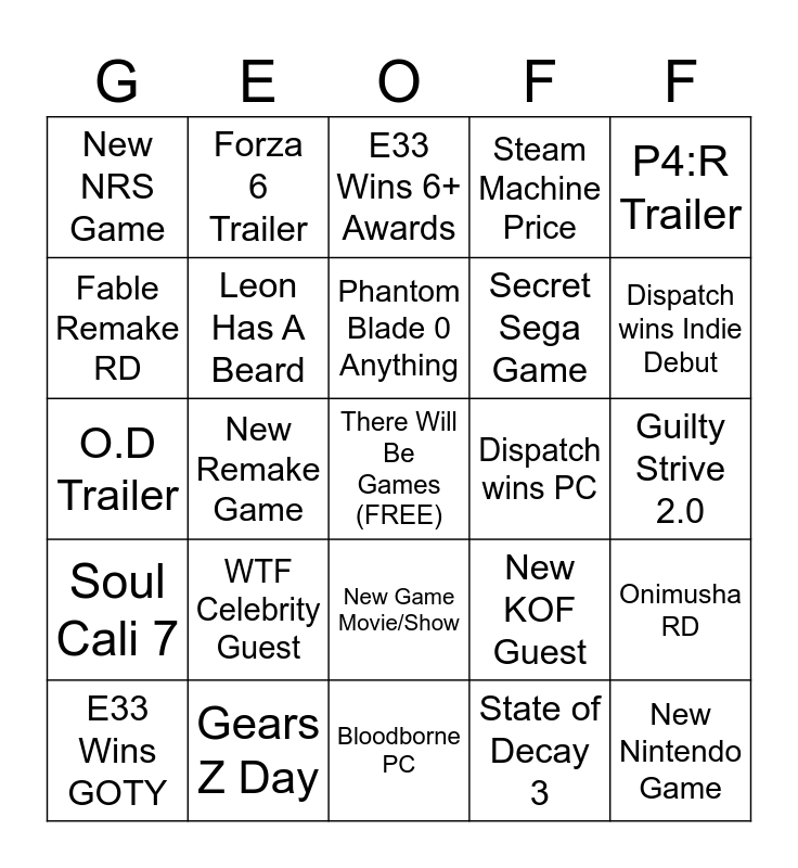 This bingo card has a free space and 29 words: E33 Wins GOTY, VF6 Gameplay, New Remake Game, New Tokon Character, New NRS Game, E33 Wins 6+ Awards, Leon Has A Beard, WTF Celebrity Guest, Dispatch wins PC, Gears Z Day, Guilty Strive 2.0, New Nintendo Game, Bloodborne PC, State of Decay 3, Dispatch wins Indie Debut, Half Life 3, New Game Movie/Show, Soul Cali 7, P4:R Trailer, O.D Trailer, New KOF Guest, New Tekken Guest, Secret Sega Game, Fable Remake RD, Steam Machine Price, Forza 6 Trailer, Onimusha RD, Phantom Blade 0 Anything and Pragmata RD.