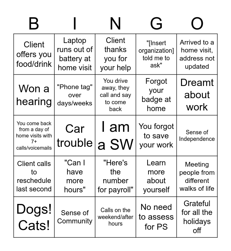 This bingo card has a free space and 24 words: "Can I have more hours", Sense of Community, You drive away, they call and say to come back, Dogs! Cats!, Arrived to a home visit, address not updated, Client offers you food/drink, Won a hearing, Laptop runs out of battery at home visit, You forgot to save your work, "Here's the number for payroll", Forgot your badge at home, You come back from a day of home visits with 7+ calls/voicemails, Learn more about yourself, Meeting people from different walks of life, "Phone tag" over days/weeks, No need to assess for PS, Sense of Independence, Client thanks you for your help, Dreamt about work, Car trouble, Grateful for all the holidays off, Client calls to reschedule last second, "[Insert organization] told me to ask" and Calls on the weekend/after hours.