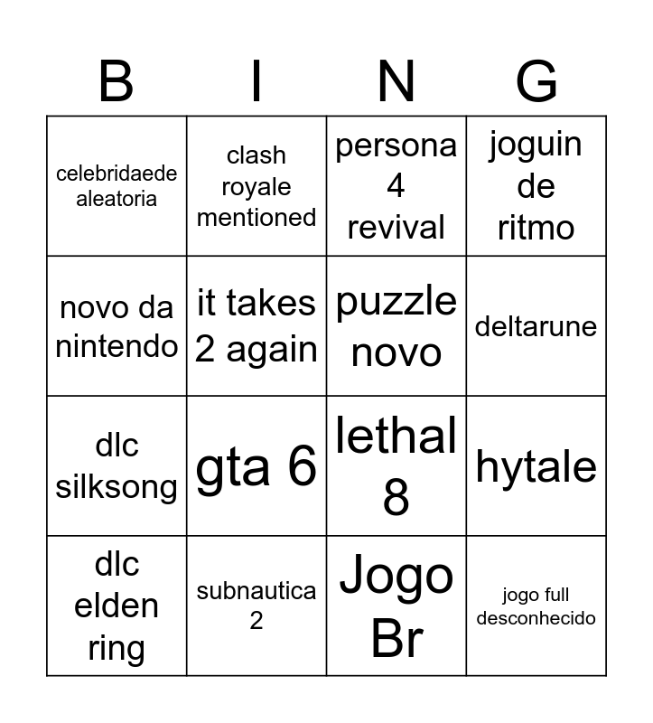 This bingo card has 16 words: subnautica 2, hytale, persona 4 revival, celebridaede aleatoria, dlc silksong, clash royale mentioned, lethal 8, Jogo Br, novo da nintendo, it takes 2 again, dlc elden ring, joguin de ritmo, gta 6, deltarune, puzzle novo and jogo full desconhecido.
