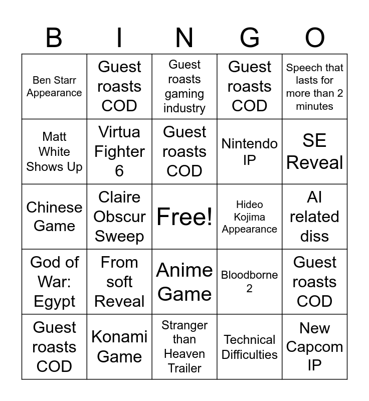 This bingo card has a free space and 29 words: Guest roasts COD, Profanity from one of the guests, Claire Obscur Sweep, Remake of any game, Ben Starr Appearance, Guest roasts gaming industry, Virtua Fighter 6, From soft Reveal, Hideo Kojima Appearance, Konami Game, AI related diss, New Capcom IP, Stranger than Heaven Trailer, Technical Difficulties, SE Reveal, Steam Machine Trailer, Anime Game, God of War: Egypt, Speech that lasts for more than 2 minutes, Chinese Game, Bloodborne 2, Geoff Wearing His Iconic Sneakers, Nintendo IP, Matt White Shows Up, Guest roasts COD, Guest roasts COD, Guest roasts COD, Guest roasts COD and Guest roasts COD.