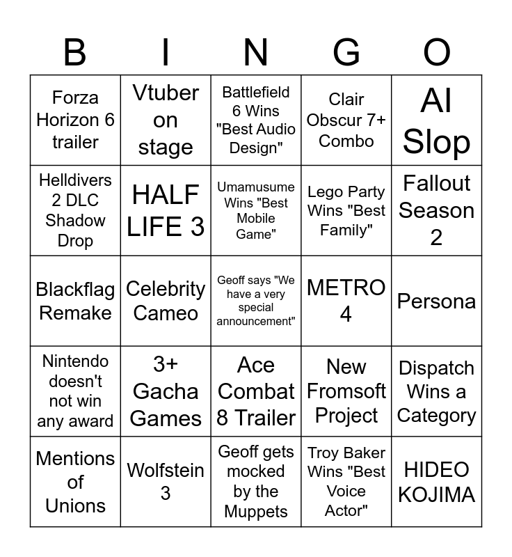 This bingo card has a free space and 24 words: 3+ Gacha Games, Wolfstein 3, Umamusume Wins "Best Mobile Game", Mentions of Unions, AI Slop, Forza Horizon 6 trailer, Helldivers 2 DLC Shadow Drop, Vtuber on stage, METRO 4, Ace Combat 8 Trailer, Lego Party Wins "Best Family", Blackflag Remake, New Fromsoft Project, Dispatch Wins a Category, HALF LIFE 3, Troy Baker Wins "Best Voice Actor", Persona, Battlefield 6 Wins "Best Audio Design", Fallout Season 2, Celebrity Cameo, HIDEO KOJIMA, Nintendo doesn't not win any award, Clair Obscur 7+ Combo and Geoff gets mocked by the Muppets.