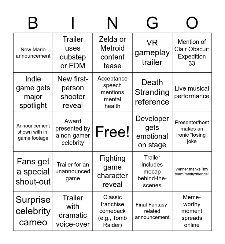 This bingo card has a free space and 25 words: Trailer for an unannounced game, Classic franchise comeback (e.g., Tomb Raider), Acceptance speech mentions mental health, Surprise celebrity cameo, Mention of Clair Obscur: Expedition 33, New Mario announcement, Indie game gets major spotlight, Trailer uses dubstep or EDM, Developer gets emotional on stage, Fighting game character reveal, Death Stranding reference, Announcement shown with in-game footage, Trailer includes mocap behind-the-scenes, Winner thanks “my team/family/friends”, New first-person shooter reveal, Surprise game that wasn’t leaked, Presenter/host makes an ironic “losing” joke, Zelda or Metroid content tease, Live musical performance, Award presented by a non-gamer celebrity, Meme-worthy moment spreads online, Trailer with dramatic voice-over, Fans get a special shout-out, VR gameplay trailer and Final Fantasy-related announcement.