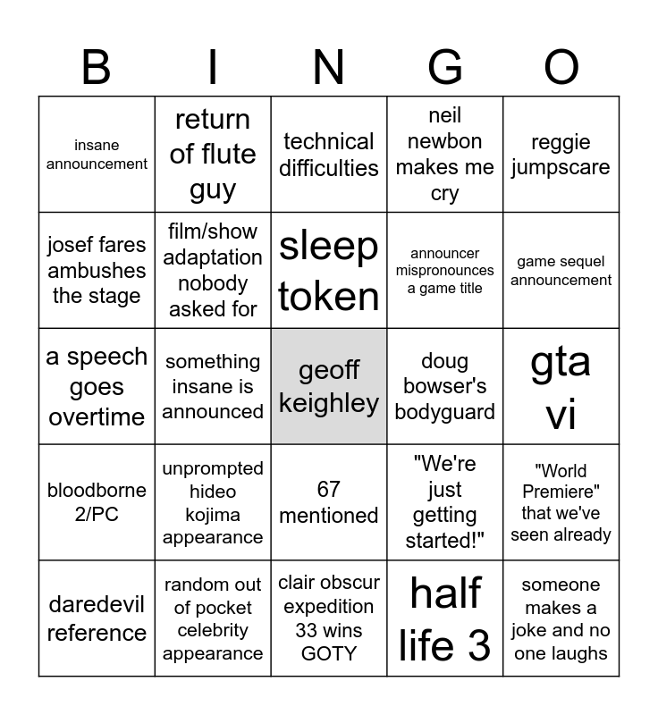 This bingo card has a free space and 24 words: unprompted hideo kojima appearance, random out of pocket celebrity appearance, sleep token, daredevil reference, reggie jumpscare, insane announcement, josef fares ambushes the stage, return of flute guy, doug bowser's bodyguard, 67 mentioned, announcer mispronounces a game title, a speech goes overtime, "We're just getting started!", "World Premiere" that we've seen already, film/show adaptation nobody asked for, half life 3, gta vi, technical difficulties, game sequel announcement, something insane is announced, someone makes a joke and no one laughs, bloodborne 2/PC, neil newbon makes me cry and clair obscur expedition 33 wins GOTY.