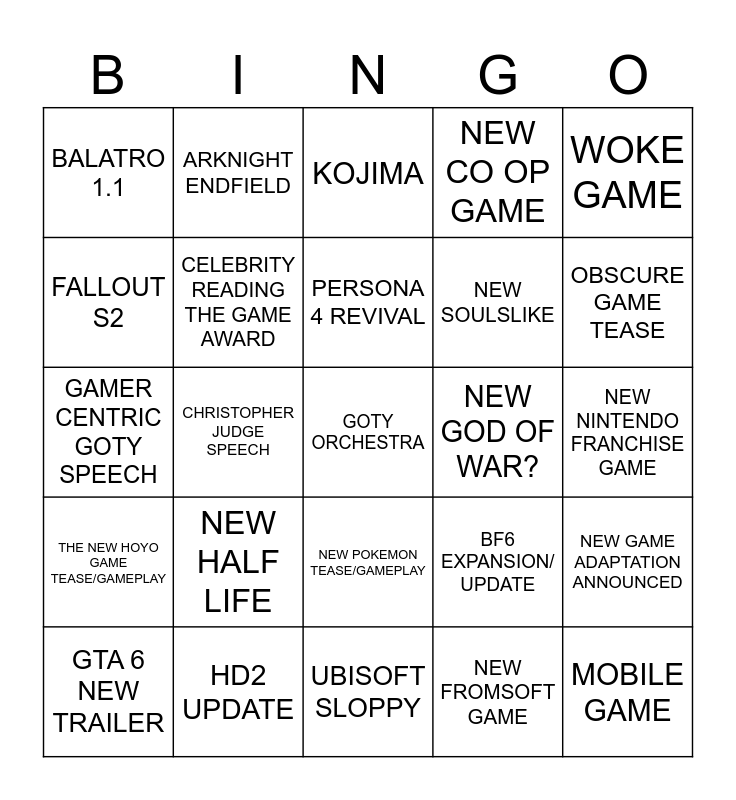 This bingo card has a free space and 24 words: GTA 6 NEW TRAILER, NEW HALF LIFE, PERSONA 4 REVIVAL, NEW FROMSOFT GAME, WOKE GAME, BALATRO 1.1, ARKNIGHT ENDFIELD, KOJIMA, NEW GOD OF WAR?, NEW NINTENDO FRANCHISE GAME, GAMER CENTRIC GOTY SPEECH, CELEBRITY READING THE GAME AWARD, BF6 EXPANSION/ UPDATE, NEW GAME ADAPTATION ANNOUNCED, FALLOUT S2, HD2 UPDATE, UBISOFT SLOPPY, NEW CO OP GAME, OBSCURE GAME TEASE, THE NEW HOYO GAME TEASE/GAMEPLAY, CHRISTOPHER JUDGE SPEECH, NEW POKEMON TEASE/GAMEPLAY, NEW SOULSLIKE and MOBILE GAME.