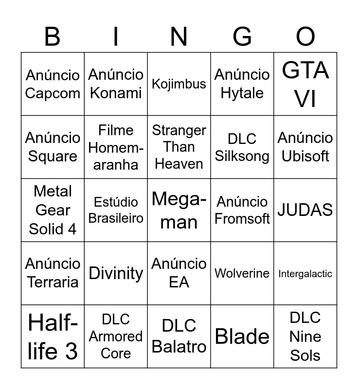This bingo card has a free space and 24 words: Divinity, DLC Armored Core, Stranger Than Heaven, Half-life 3, GTA VI, Anúncio Capcom, Anúncio Square, Anúncio Konami, Anúncio Fromsoft, Anúncio EA, DLC Silksong, Metal Gear Solid 4, Wolverine, Intergalactic, Filme Homem-aranha, Blade, JUDAS, Kojimbus, Anúncio Ubisoft, Estúdio Brasileiro, DLC Nine Sols, Anúncio Terraria, Anúncio Hytale and DLC Balatro.