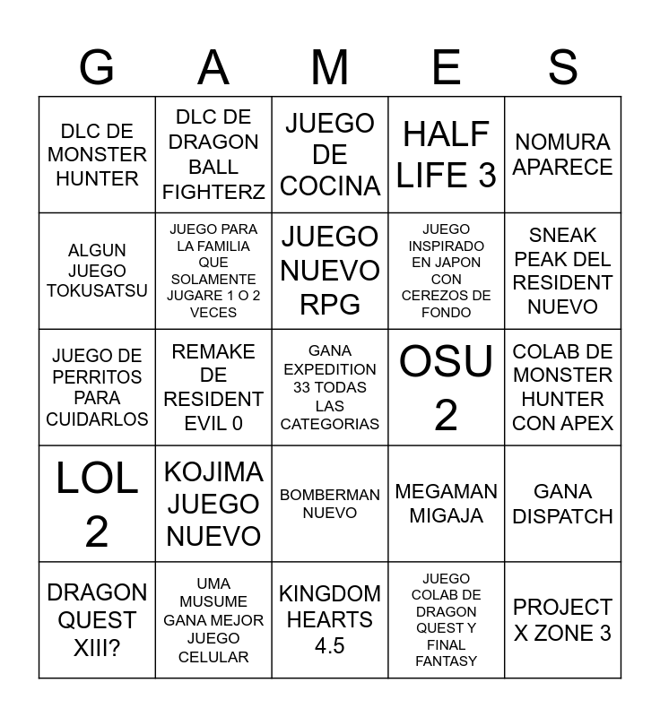 This bingo card has a free space and 24 words: KOJIMA JUEGO NUEVO, UMA MUSUME GANA MEJOR JUEGO CELULAR, JUEGO NUEVO RPG, DRAGON QUEST XIII?, NOMURA APARECE, DLC DE MONSTER HUNTER, ALGUN JUEGO TOKUSATSU, DLC DE DRAGON BALL FIGHTERZ, OSU 2, BOMBERMAN NUEVO, JUEGO INSPIRADO EN JAPON CON CEREZOS DE FONDO, JUEGO DE PERRITOS PARA CUIDARLOS, MEGAMAN MIGAJA, GANA DISPATCH, JUEGO PARA LA FAMILIA QUE SOLAMENTE JUGARE 1 O 2 VECES, JUEGO COLAB DE DRAGON QUEST Y FINAL FANTASY, COLAB DE MONSTER HUNTER CON APEX, JUEGO DE COCINA, SNEAK PEAK DEL RESIDENT NUEVO, REMAKE DE RESIDENT EVIL 0, PROJECT X ZONE 3, LOL 2, HALF LIFE 3 and KINGDOM HEARTS 4.5.
