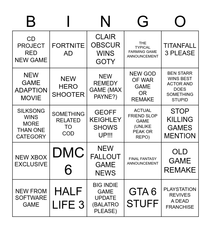 This bingo card has a free space and 24 words: DMC 6, HALF LIFE 3, NEW REMEDY GAME (MAX PAYNE?), NEW FROM SOFTWARE GAME, TITANFALL 3 PLEASE, CD PROJECT RED NEW GAME, NEW GAME ADAPTION MOVIE, FORTNITE AD, ACTUAL FRIEND SLOP GAME (UNLIKE PEAK OR REPO), NEW FALLOUT GAME NEWS, NEW GOD OF WAR GAME OR REMAKE, SILKSONG WINS MORE THAN ONE CATEGORY, FINAL FANTASY ANNOUNCEMENT, OLD GAME REMAKE, NEW HERO SHOOTER, GTA 6 STUFF, STOP KILLING GAMES MENTION, CLAIR OBSCUR WINS GOTY, BEN STARR WINS BEST ACTOR AND DOES SOMETHING STUPID, SOMETHING RELATED TO COD, PLAYSTATION REVIVES A DEAD FRANCHISE, NEW XBOX EXCLUSIVE, THE TYPICAL FARMING GAME ANNOUNCEMENT and BIG INDIE GAME UPDATE (BALATRO PLEASE).