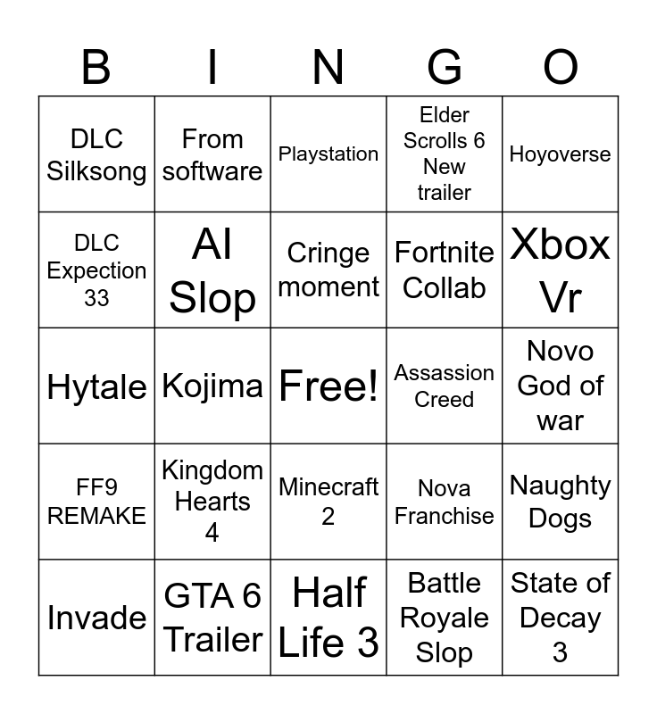This bingo card has a free space and 24 words: Kingdom Hearts 4, GTA 6 Trailer, Cringe moment, Invade, Hoyoverse, DLC Silksong, DLC Expection 33, From software, Assassion Creed, Minecraft 2, Fortnite Collab, Hytale, Nova Franchise, Naughty Dogs, AI Slop, Battle Royale Slop, Novo God of war, Playstation, Xbox Vr, Kojima, State of Decay 3, FF9 REMAKE, Elder Scrolls 6 New trailer and Half Life 3.