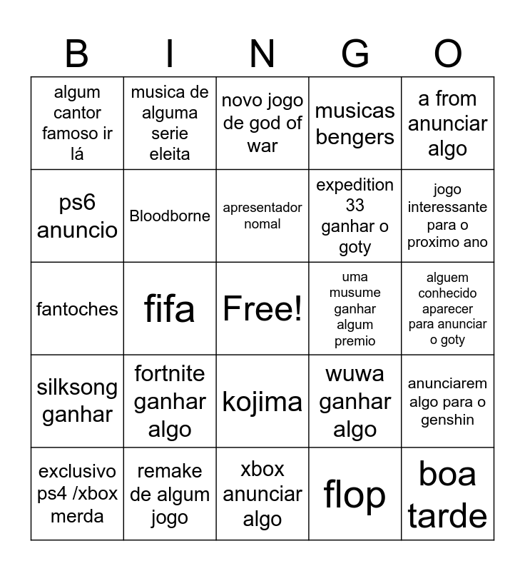 This bingo card has a free space and 24 words: fortnite ganhar algo, remake de algum jogo, apresentador nomal, exclusivo ps4 /xbox merda, a from anunciar algo, algum cantor famoso ir lá, ps6 anuncio, musica de alguma serie eleita, uma musume ganhar algum premio, kojima, expedition 33 ganhar o goty, fantoches, wuwa ganhar algo, anunciarem algo para o genshin, Bloodborne, flop, alguem conhecido aparecer para anunciar o goty, novo jogo de god of war, jogo interessante para o proximo ano, fifa, boa tarde, silksong ganhar, musicas bengers and xbox anunciar algo.