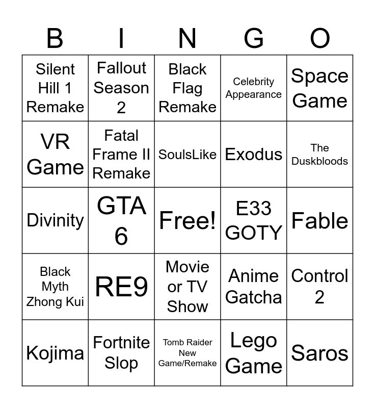 This bingo card has a free space and 24 words: RE9, Fortnite Slop, SoulsLike, Kojima, Space Game, Silent Hill 1 Remake, VR Game, Fallout Season 2, E33 GOTY, Movie or TV Show, Exodus, Divinity, Anime Gatcha, Control 2, Fatal Frame II Remake, Lego Game, Fable, Black Flag Remake, The Duskbloods, GTA 6, Saros, Black Myth Zhong Kui, Celebrity Appearance and Tomb Raider New Game/Remake.