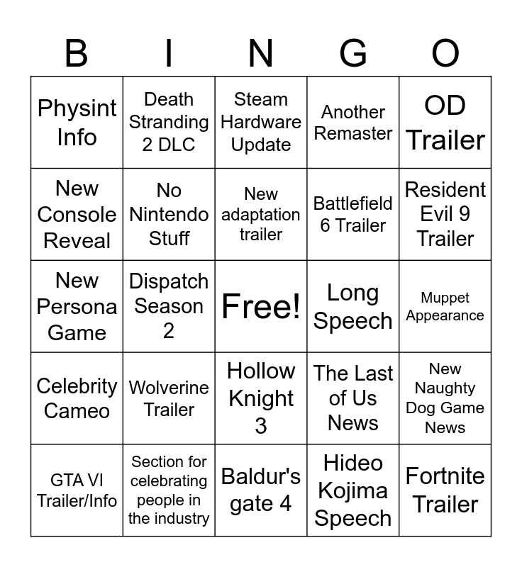 This bingo card has a free space and 24 words: GTA VI Trailer/Info, Wolverine Trailer, New adaptation trailer, Hideo Kojima Speech, OD Trailer, Physint Info, Death Stranding 2 DLC, Steam Hardware Update, Long Speech, Muppet Appearance, New Persona Game, No Nintendo Stuff, The Last of Us News, New Naughty Dog Game News, New Console Reveal, Section for celebrating people in the industry, Baldur's gate 4, Another Remaster, Resident Evil 9 Trailer, Celebrity Cameo, Dispatch Season 2, Hollow Knight 3, Battlefield 6 Trailer and Fortnite Trailer.