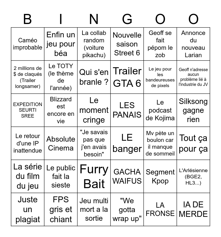 This bingo card has 36 words: GACHA WAIFUS, Furry Bait, "We gotta wrap up", 2 millions de $ de claqués (Trailer longsamer), Le retour d'une IP inattendue, LES PANAIS, Le TOTY (le thème de l'année), Jeu multi mort a la sortie, Geoff se fait pépom le zob, Segment Kpop, Geoff n'adresse aucun problème lié à l'industrie du JV, Nouvelle saison Street 6, L'Arlésienne (BGE2, HL3...), Blizzard est encore en vie, Trailer GTA 6, Caméo improbable, La série du film du jeu, Le podcast de Kojima, EXPEDITION SEURTI SREE, La collab random (voiture pikachu), Le moment cringe, Absolute Cinema, LE banger, "Je savais pas que j'en avais besoin", Mv pète un boulon car il manque de sommeil, Enfin un jeu pour béa, Le jeu pour les bandeureuses de pixels, FPS gris et chiant, Qui s'en branle ?, Annonce du nouveau Larian, IA DE MERDE, Juste un plagiat, Tout ça pour ça, Silksong gagne rien, Le public fait la sieste and LA FRONSE.