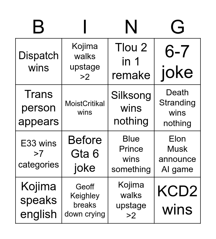 This bingo card has 16 words: Geoff Keighley breaks down crying, Elon Musk announce AI game, Tlou 2 in 1 remake, Dispatch wins, E33 wins >7 categories, Kojima walks upstage >2, Blue Prince wins something, Kojima walks upstage >2, Trans person appears, MoistCritikal wins, Kojima speaks english, 6-7 joke, Before Gta 6 joke, Death Stranding wins nothing, Silksong wins nothing and KCD2 wins.