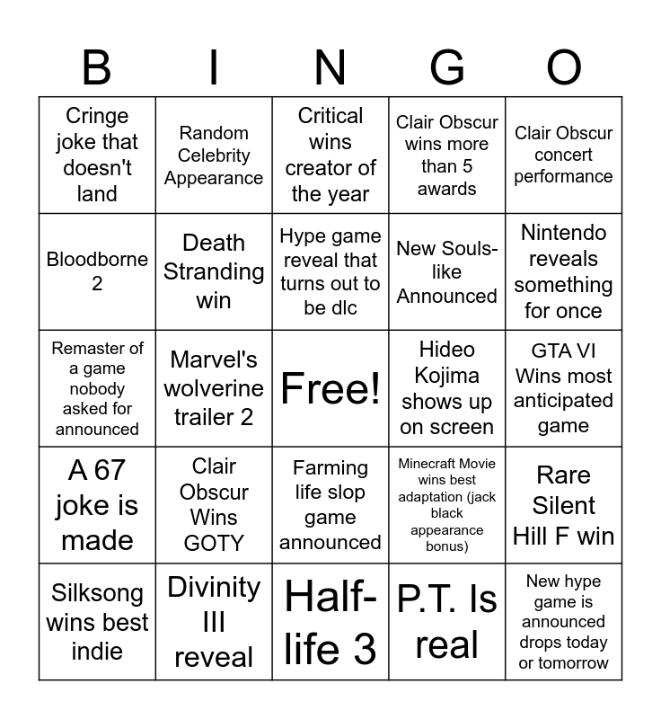 This bingo card has a free space and 24 words: Clair Obscur Wins GOTY, Divinity III reveal, Hype game reveal that turns out to be dlc, Silksong wins best indie, Clair Obscur concert performance, Cringe joke that doesn't land, Bloodborne 2, Random Celebrity Appearance, Hideo Kojima shows up on screen, Farming life slop game announced, New Souls-like Announced, Remaster of a game nobody asked for announced, Minecraft Movie wins best adaptation (jack black appearance bonus), Rare Silent Hill F win, Death Stranding win, P.T. Is real, GTA VI Wins most anticipated game, Critical wins creator of the year, Nintendo reveals something for once, Marvel's wolverine trailer 2, New hype game is announced drops today or tomorrow, A 67 joke is made, Clair Obscur wins more than 5 awards and Half-life 3.