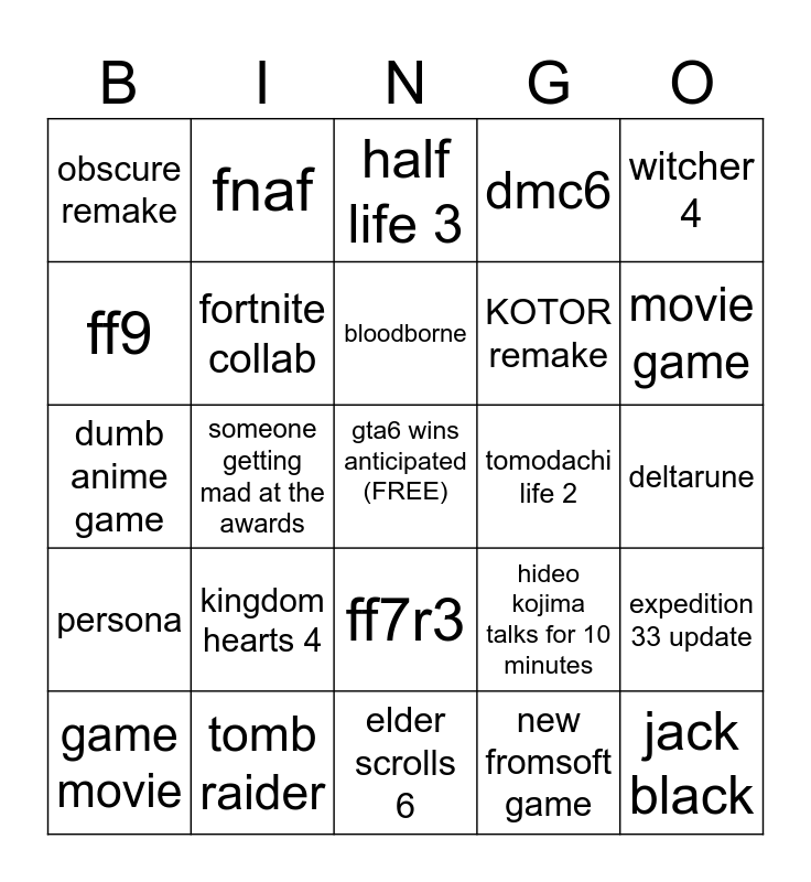 This bingo card has a free space and 24 words: kingdom hearts 4, tomb raider, bloodborne, game movie, witcher 4, obscure remake, ff9, fnaf, tomodachi life 2, ff7r3, KOTOR remake, dumb anime game, hideo kojima talks for 10 minutes, expedition 33 update, fortnite collab, new fromsoft game, deltarune, half life 3, movie game, someone getting mad at the awards, jack black, persona, dmc6 and elder scrolls 6.
