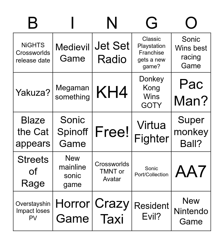 This bingo card has a free space and 24 words: New mainline sonic game, Horror Game, KH4, Overstayshin Impact loses PV, Sonic Wins best racing Game, NiGHTS Crossworlds release date, Yakuza?, Medievil Game, Virtua Fighter, Crossworlds TMNT or Avatar, Donkey Kong Wins GOTY, Blaze the Cat appears, Sonic Port/Collection, AA7, Megaman something, Resident Evil?, Super monkey Ball?, Jet Set Radio, Pac Man?, Sonic Spinoff Game, New Nintendo Game, Streets of Rage, Classic Playstation Franchise gets a new game? and Crazy Taxi.