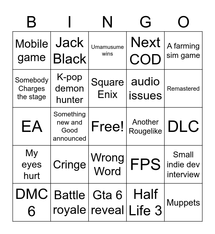 This bingo card has a free space and 44 words: Hideo Kojima, Muppets, instrumentalist going ham, DMC 6, Bloodborne 2/pc port, Half Life 3, Umamusume wins, Ai Gen game/ad, A farming sim game, Battle royale, Next COD, Another Rougelike, Wrong Word, Cringe, Christopher Judge, Gta 6 reveal, Capcom game, EA, Todd Howard, Remastered, Jack Black, Anime gooner slop, Vtuber, Mobile game, Fighting game, DLC, Claire obscure wins 4 categories, Rivals announcement, FPS, My eyes hurt, shadow drops, Small indie dev interview, Big company interview, AAA Slop, Something new and Good announced, Horror game, PlayStation exclusive, Xbox Share game, Square Enix, Somebody Charges the stage, audio issues, Inclusive interview/ girl power, K-pop demon hunter and Video game movie.