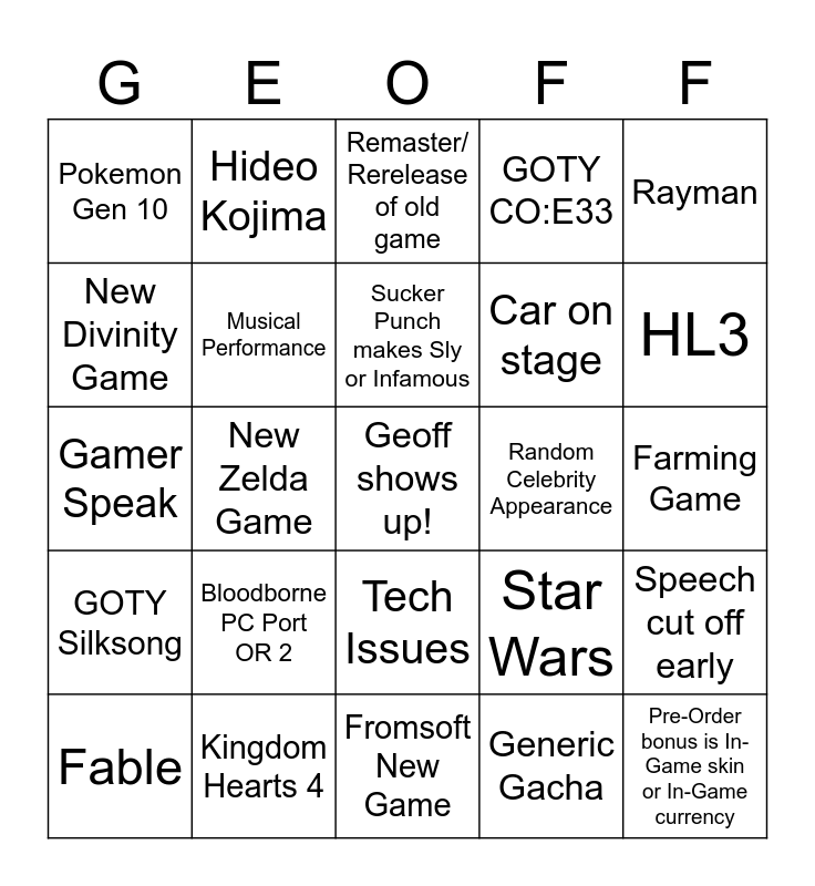 This bingo card has a free space and 24 words: Bloodborne PC Port OR 2, Kingdom Hearts 4, Sucker Punch makes Sly or Infamous, Fable, Rayman, Pokemon Gen 10, New Divinity Game, Hideo Kojima, Random Celebrity Appearance, Tech Issues, Car on stage, Gamer Speak, Star Wars, Speech cut off early, Musical Performance, Generic Gacha, Farming Game, Remaster/ Rerelease of old game, HL3, New Zelda Game, Pre-Order bonus is In-Game skin or In-Game currency, GOTY Silksong, GOTY CO:E33 and Fromsoft New Game.