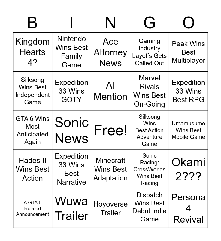 This bingo card has a free space and 24 words: Expedition 33 Wins Best Narrative, Wuwa Trailer, AI Mention, A GTA 6 Related Announcement, Peak Wins Best Multiplayer, Kingdom Hearts 4?, Silksong Wins Best Independent Game, Nintendo Wins Best Family Game, Silksong Wins Best Action Adventure Game, Minecraft Wins Best Adaptation, Marvel Rivals Wins Best On-Going, GTA 6 Wins Most Anticipated Again, Sonic Racing: CrossWorlds Wins Best Racing, Okami 2???, Expedition 33 Wins GOTY, Dispatch Wins Best Debut Indie Game, Umamusume Wins Best Mobile Game, Ace Attorney News, Expedition 33 Wins Best RPG, Sonic News, Persona 4 Revival, Hades II Wins Best Action, Gaming Industry Layoffs Gets Called Out and Hoyoverse Trailer.