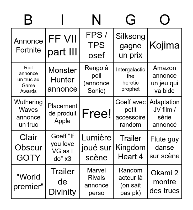 This bingo card has a free space and 24 words: Goeff "If you love VG as I do" x3, Trailer de Divinity, Rengo à poil (annonce Sonic), "World premier", Kojima, Annonce Fortnite, Riot annonce un truc au Game Awards, FF VII part III, Goeff avec petit accessoire random, Lumière joué sur scène, Intergalactic the heretic prophet, Wuthering Waves annonce un truc, Trailer Kingdom Heart 4, Flute guy danse sur scène, Monster Hunter annonce, Random acteur là (on sait pas pk), Adaptation JV film / série annoncé, FPS / TPS osef, Amazon annonce un jeu qui va bide, Placement de produit Apple, Okami 2 montre des trucs, Clair Obscur GOTY, Silksong gagne un prix and Marvel Rivals annonce perso.